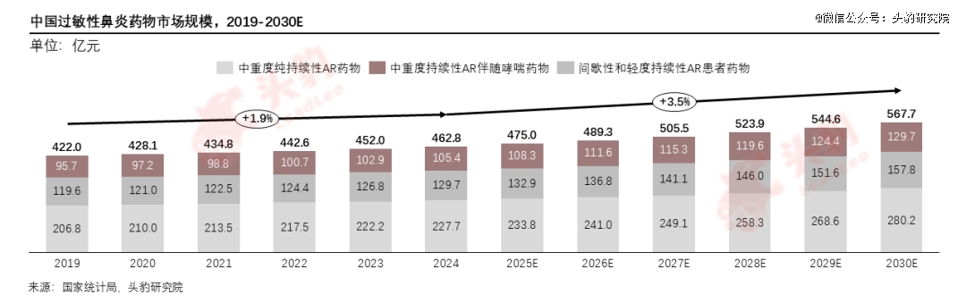 中国过敏性鼻炎药物市场规模由2019年的422.0亿元增加至2024年的462.8亿元,年复合增速为1.9%,预计未来将以3.5%的增速持续增长至2030年的567.7亿元。