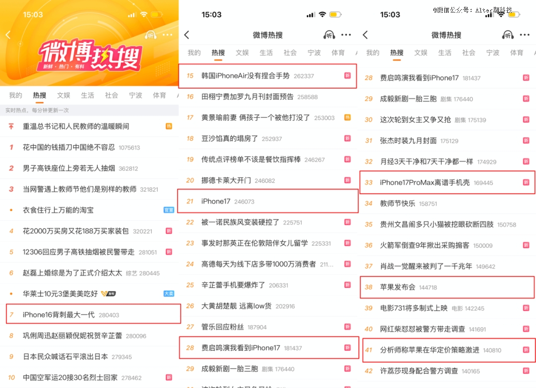 先来看微博热搜,一共有7个苹果发布会相关的话题还在热搜榜上,其中“苹果发布会”已经掉到了38位,取而代之的是一系列由发布会衍生出的新话题,涵盖价格、明星效应、周边产品以及社会争议等不同维度。从“单一主话题”到“多元子话题”的演变,标致着信息的发酵与裂变。