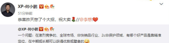 微博上,何小鹏还在理想L9公布转天写了一段话:在猛烈竞争的、全球市场、非快销品行业、2c非珍爱领域,有哪个好产物是靠精准定位,在中期或耐久可以获得优势或壁垒的?话音刚落,理想官方转发,并给了一颗红心。