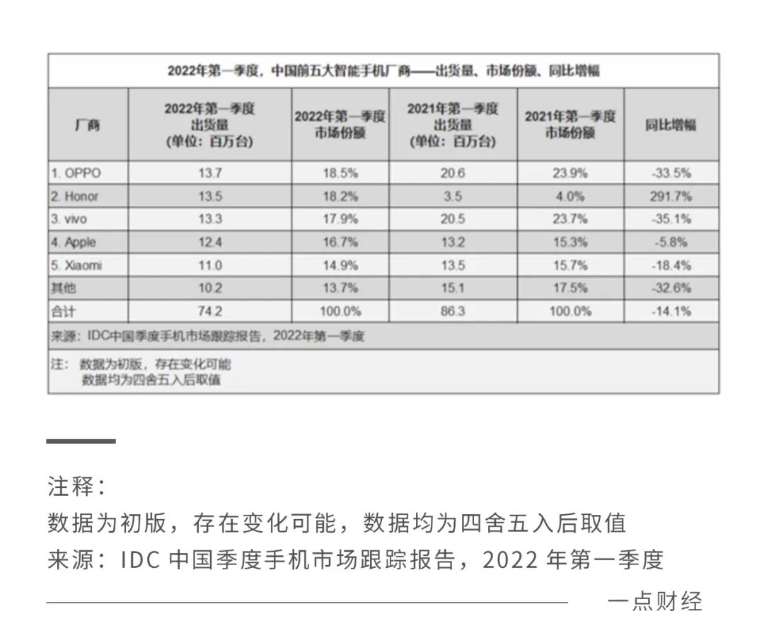 在竞逐浮沉中,一些曾耳熟能详的品牌正逐渐退出舞台。IDC数据显示,今年一季度,中国智能手机市场出货量前五名厂商为OPPO、荣耀、vivo、苹果和小米,总市占率到达86.2%,相比去年82.6%有所提升,这意味着行业马太效应愈加凸显,小众手机的生计空间愈发逼仄。