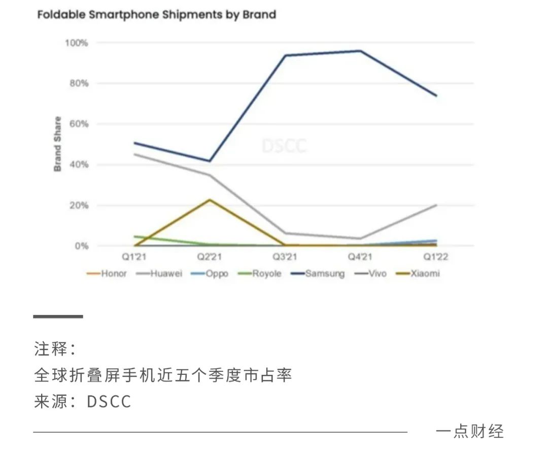 得益于产物优化和售价大幅降低,折叠屏销量迎来了小发作,据咨询机构DSCC数据,2022年第一季度,全球折叠屏智能机总出货量为222万部,同比大涨了571%,其中三星品牌稳居第一。纵然云云,与主流机型单品牌万万、上亿相比,折叠屏销量只能算是毛毛雨。