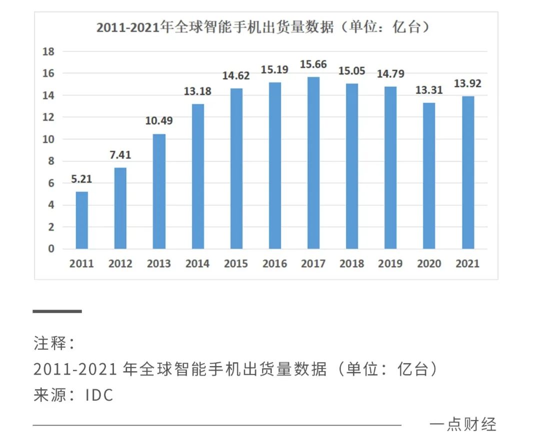 据IDC统计,全球手机出货量在2017年到达岑岭的15.66亿台后,自2018年最先逐年下降,2020年蓦地受疫情影响,降幅较大,2021年有所上升,但行业整体遇冷仍在继续。