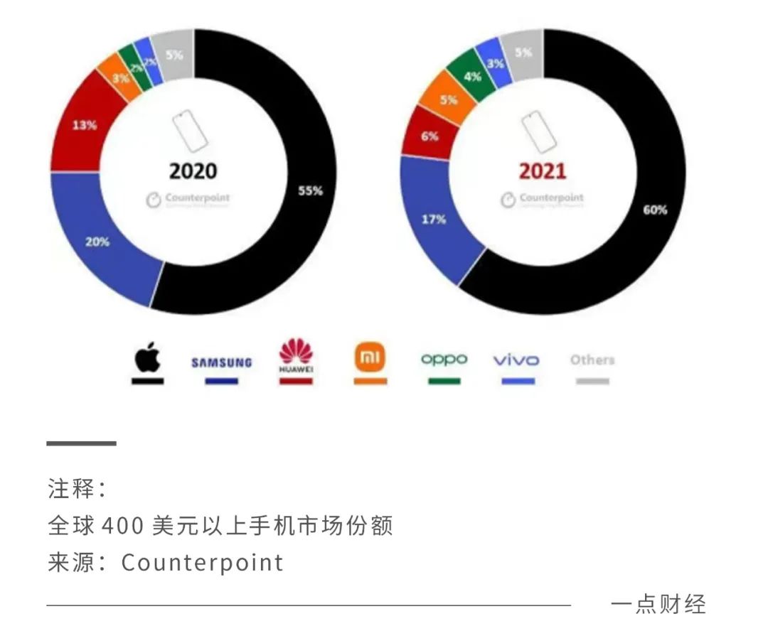 华为失速后,2021年全球高端手机(400美元以上)整体排名上,苹果以60%的占比取得绝对领先职位,三星以17%的份额占有第二位,华为、小米、OPPO划分以6%、5%、4%的份额位列第三至第五名,显然,华为让出的高端市场份额照样被苹果吞下了。