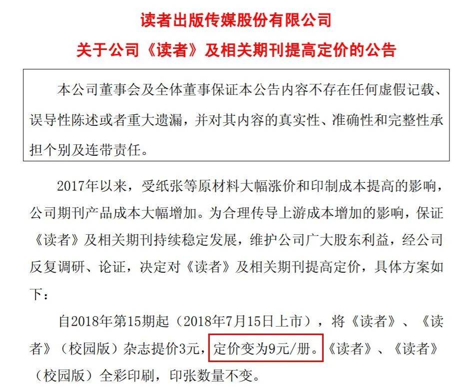 同年6月,读者出书团体董事长王永生又因涉嫌严重违纪违法被立案考察,一时间满城风雨;月尾,读者传媒公布了涨价的通告,提价为9元/本,又惹出舆论纷纷。