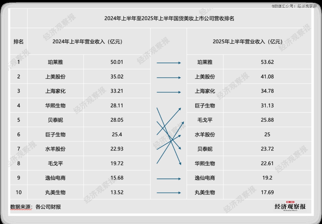 营收排名的位次变动主要集中在腰部。今年上半年的营收第四名为巨子生物,营收为31.13亿元,较去年同期上升2名;第五名的毛戈平营收为25.88亿元,较去年同期上升3名;第六名的水羊股份营收为25亿元,较去年同期上升1名;第七、八名为贝泰妮和华熙生物,营收分别为23.72亿元、22.61亿元,较去年同期后退2名、4名。